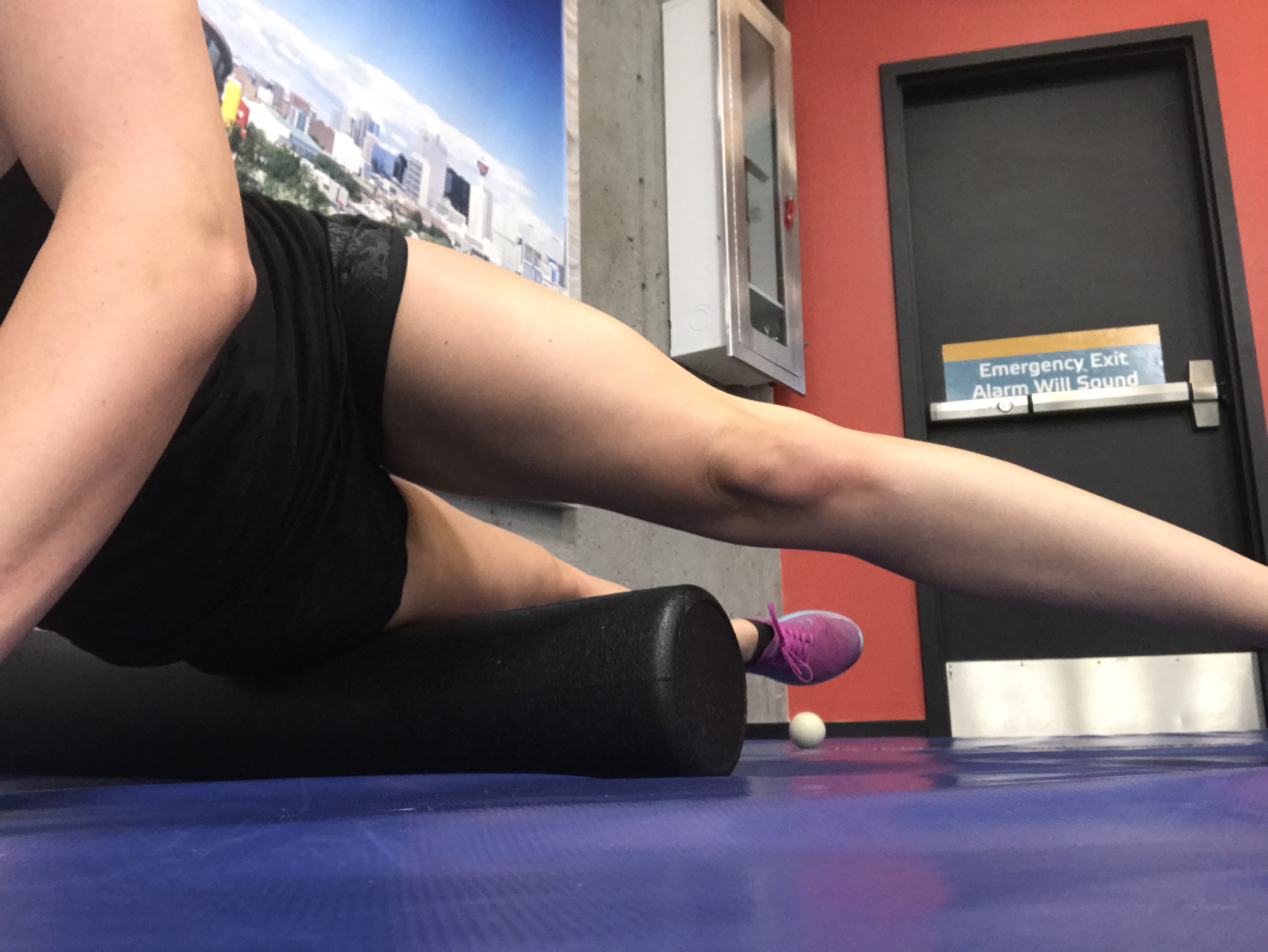 - IT Band (outside of thigh) – Place the outside of your thigh on the roller, rolling from above your knee up into the hip.
